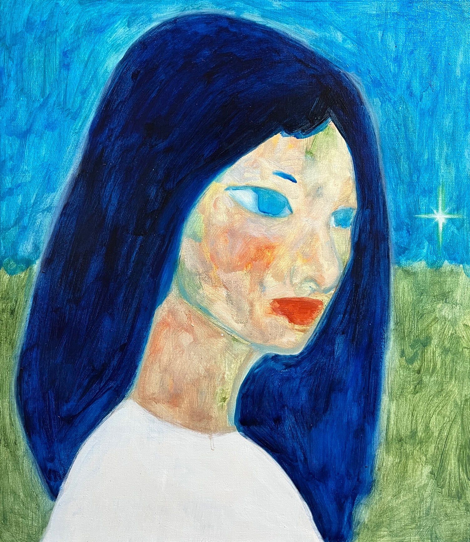 Jineui Heo is a Korean painter whose work centers on intimate figurative portraits that explore memory, perception, and emotional transition. Working primarily in oil on canvas and occasionally on wooden panels, she creates striking compositions defined by bold color contrasts and simplified backgrounds. Her figures, often depicted in moments of stillness, appear suspended between presence and disappearance, embodying quiet psychological tension.