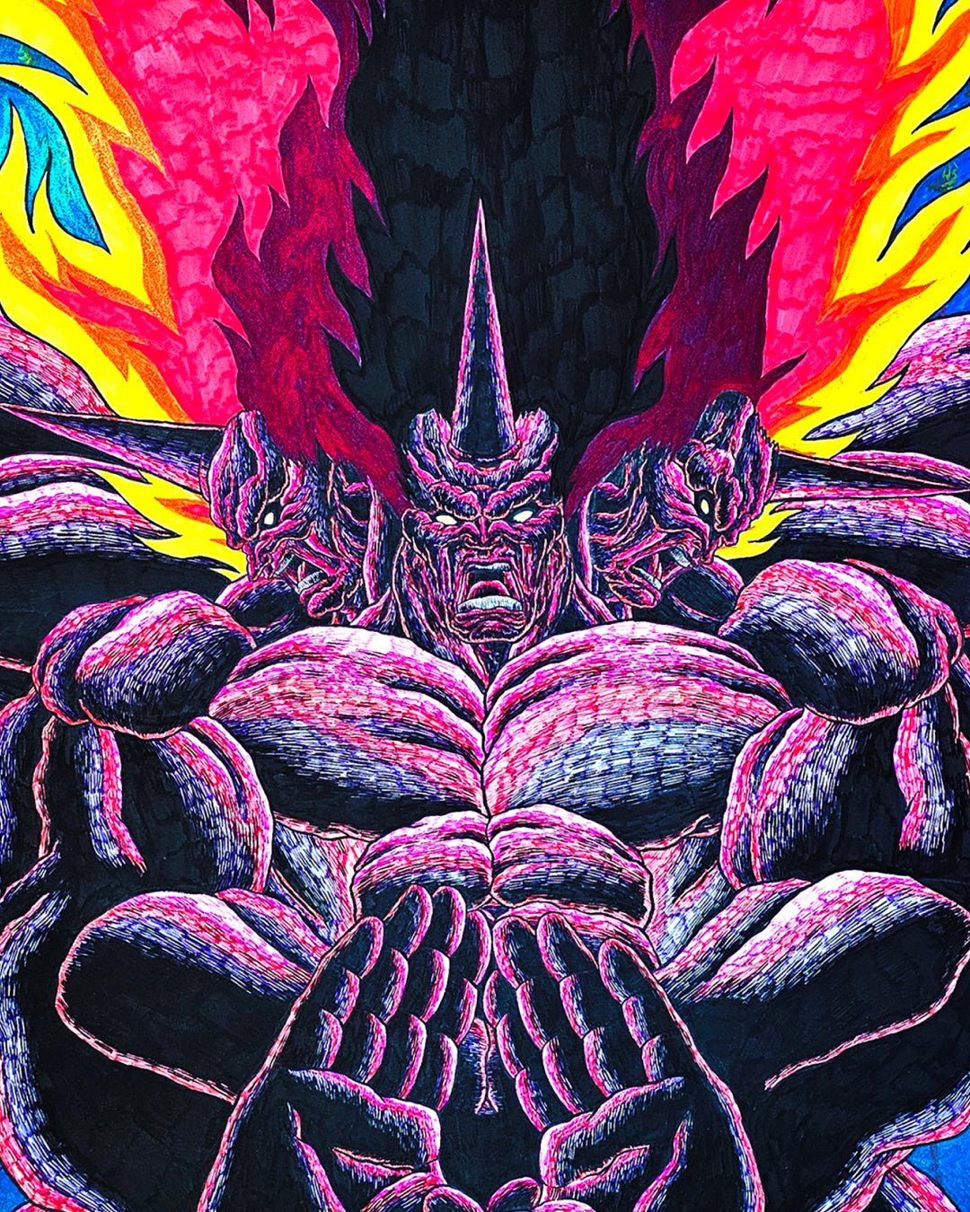 Kang’s works emerge from spontaneous and eruptive images rising from the unconscious. Rather than controlling or refining these impulses, he captures and fixes them into concrete visual forms, allowing raw inner energies to surface directly within the work. This method operates through a mythological mechanism that semiotizes the collective unconscious, translating shared psychological states into symbolic language.
