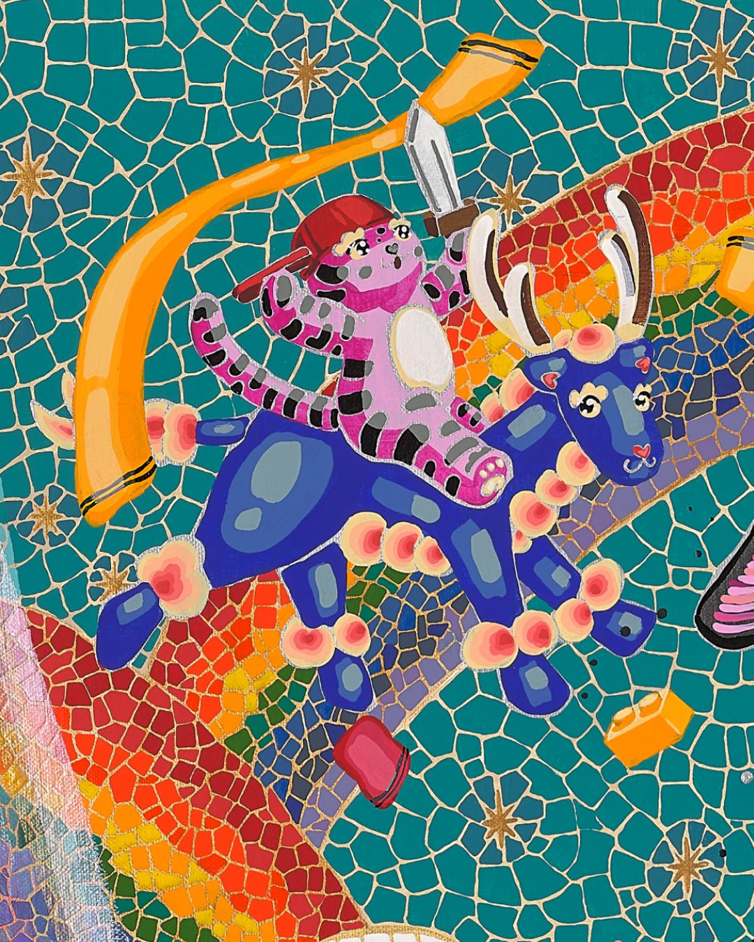 By rearranging Eastern symbols such as tigers, blue giraffes, the sun-and-mountain motif, peonies, clouds, water, and cranes, I infuse each work with personal emotion and recollection.