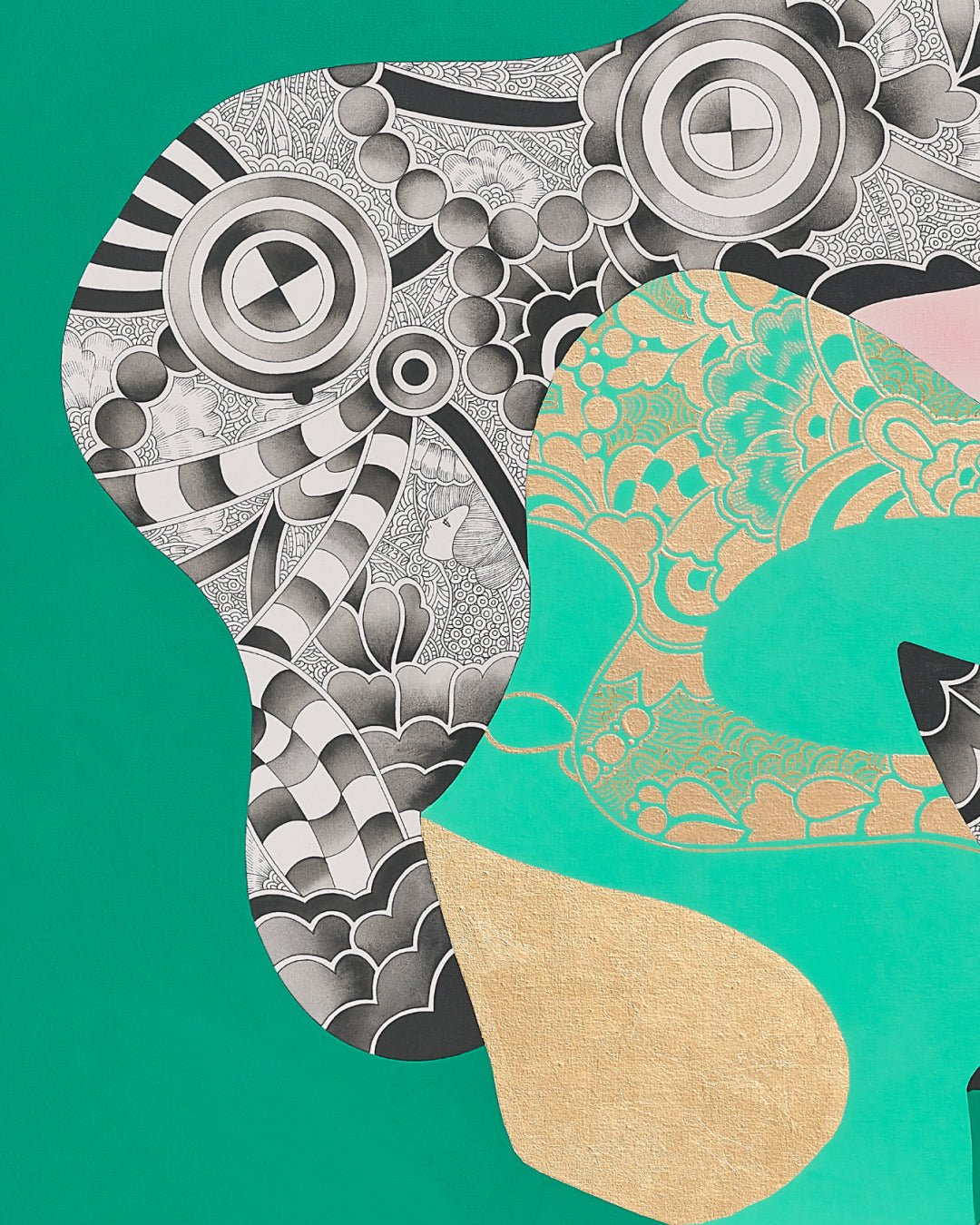 She separates her practice into two distinct genres — figurative and abstract. In her figurative works, the ornate beauty reminiscent of Art Nouveau reveals the anxieties, wounds, and social contradictions hidden beneath the surface.