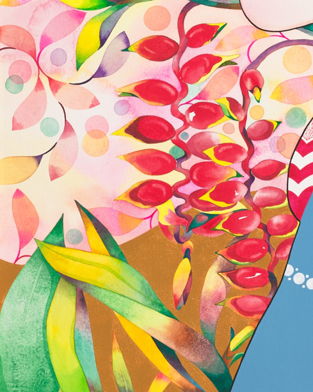 She separates her practice into two distinct genres — figurative and abstract. In her figurative works, the ornate beauty reminiscent of Art Nouveau reveals the anxieties, wounds, and social contradictions hidden beneath the surface.