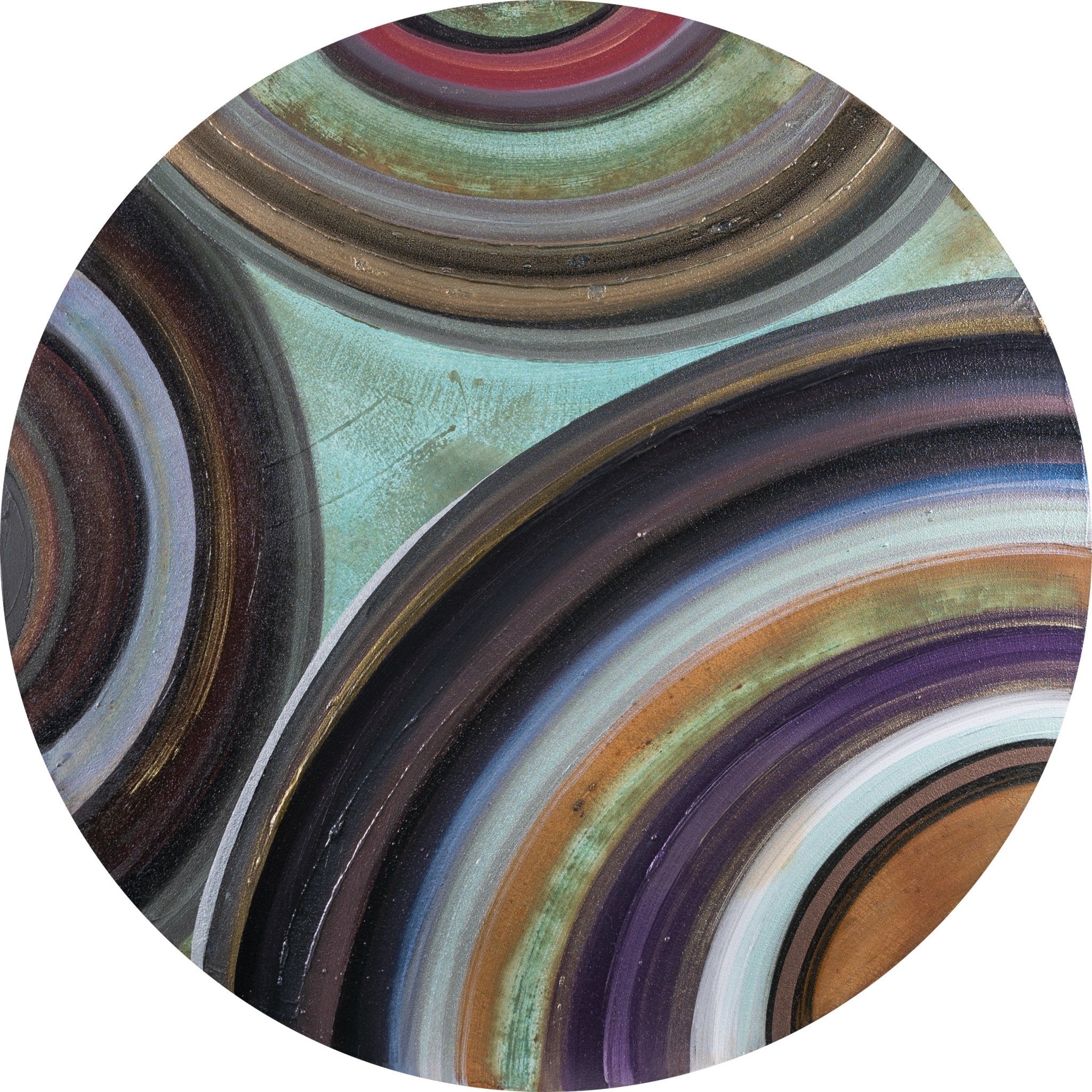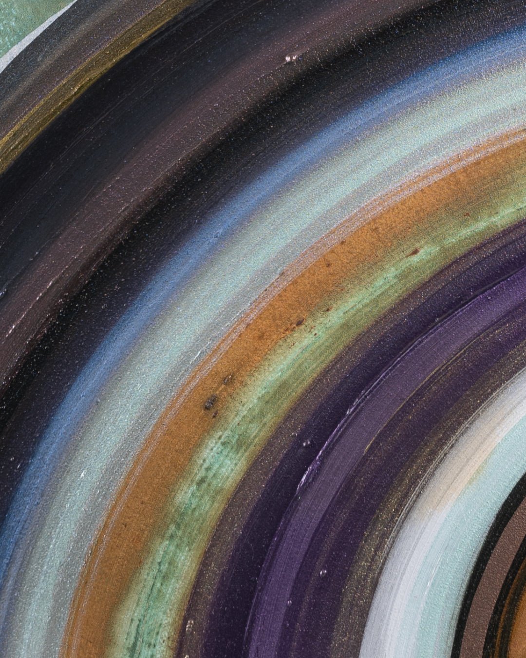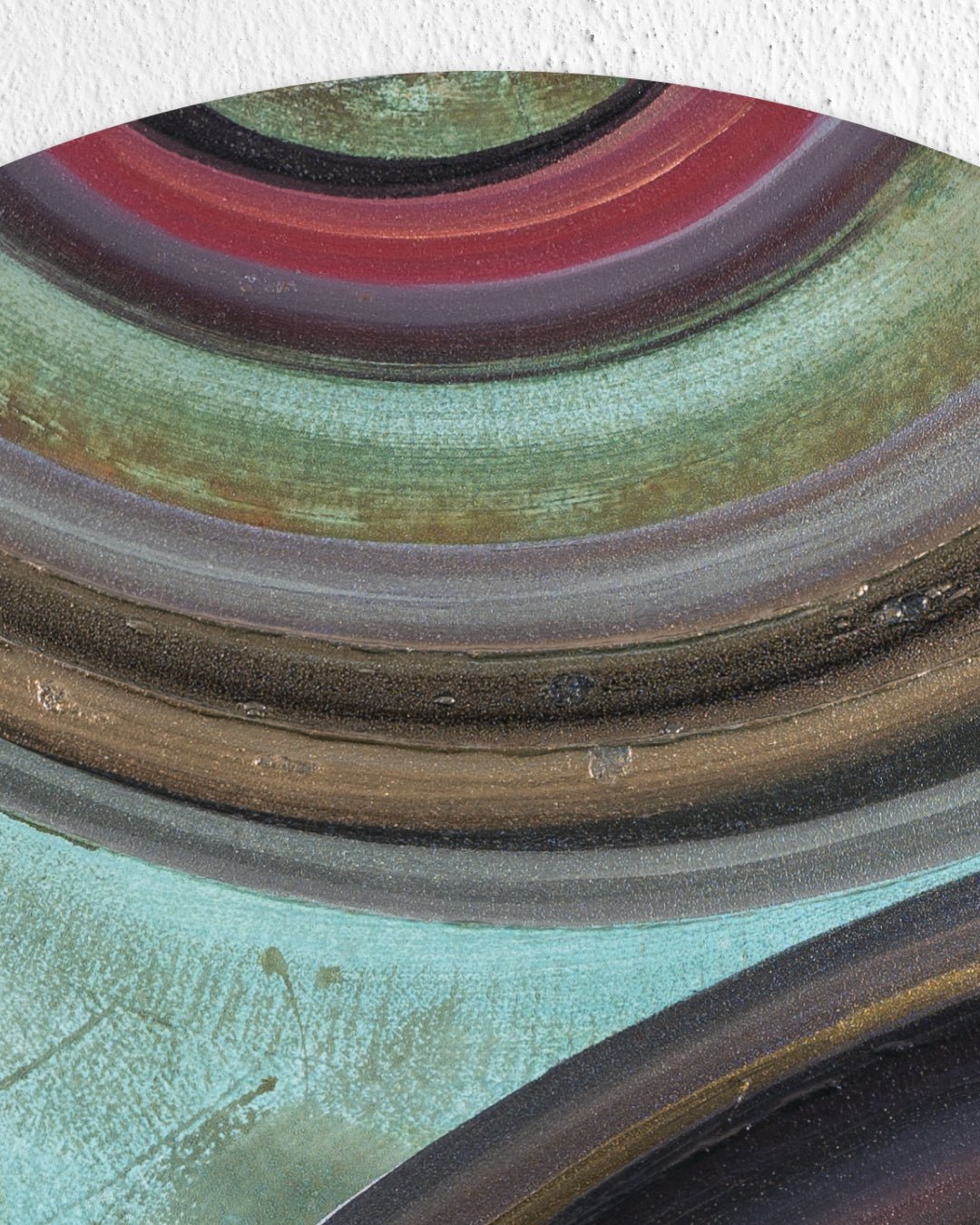 Her abstract works, in contrast, delve into the temporality of human existence and the vastness of the cosmos. Through material and technical experimentation—such as metal corrosion, the use of iron, bronze, and other reactive mediums—she expands the boundaries of painting itself. These surfaces reflect cycles of decay, transformation, and rebirth, echoing the rhythm of time and the universe.
