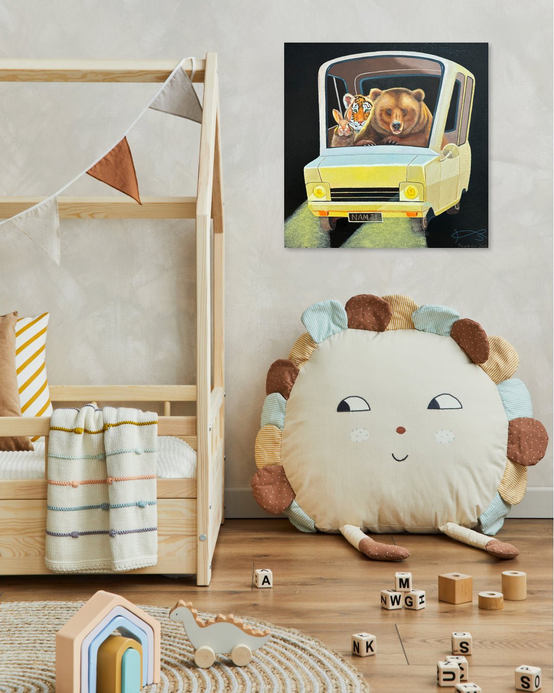 The animals in my paintings are not mere subjects; they are “another face of ourselves,” a mirror of humanity. Tigers, polar bears, rabbits, penguins, and many others appear dressed like humans, interacting with everyday objects and landscapes, embracing one another. These scenes symbolize equality without discrimination and the warmth of mutual comfort.