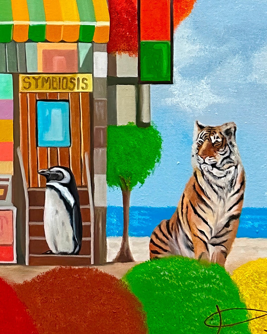 Under the overarching theme of “Symbiosis,” my work imagines a harmonious world where humans, animals, and nature transcend boundaries and coexist as one interconnected family. The animals that appear in these paintings—tigers, polar bears, rabbits, penguins, and many others—are not simply characters within a scene. They represent another face of ourselves, reflecting human emotion, vulnerability, and warmth.