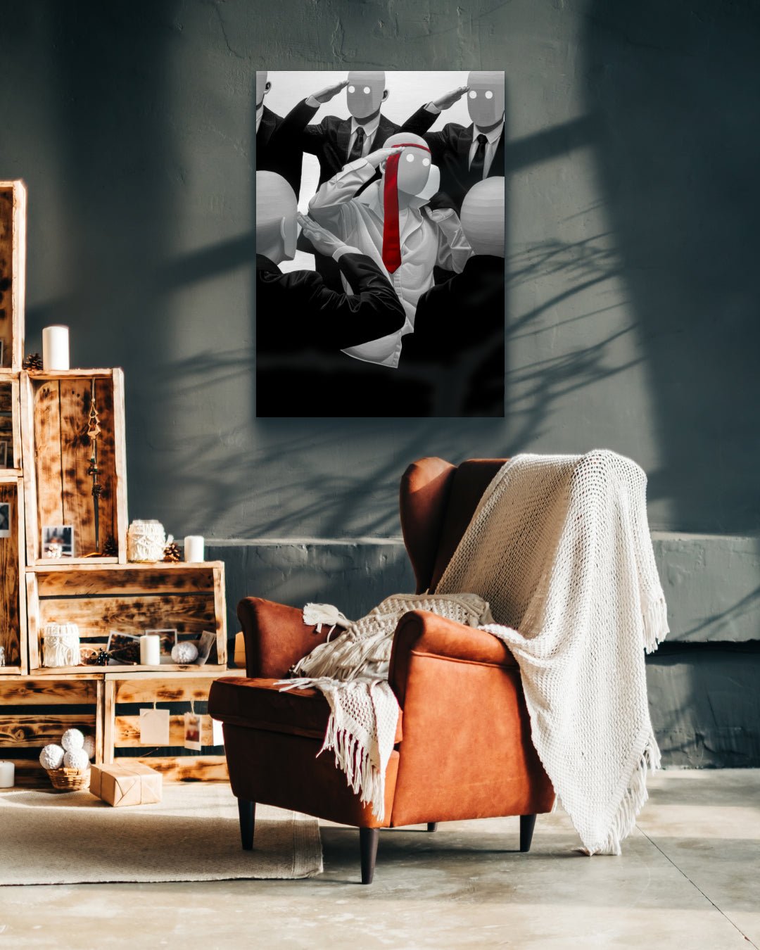 A recurring motif in his work is the bald, suit-clad figure. Stripped of identifiable features, these anonymous characters function as universal symbols rather than portraits. They suggest that social anxiety, exhaustion, and frustration are not confined to a particular class, profession, or identity, but are conditions that cut across society as a whole. The uniformity of the figures reflects the repetitive structures of contemporary life, while their subtle gestures and postures reveal quiet resistance and emotional tension.