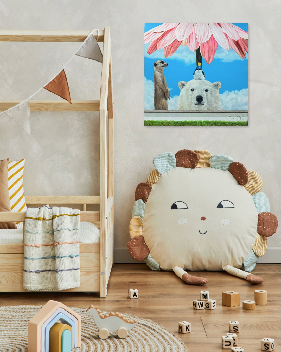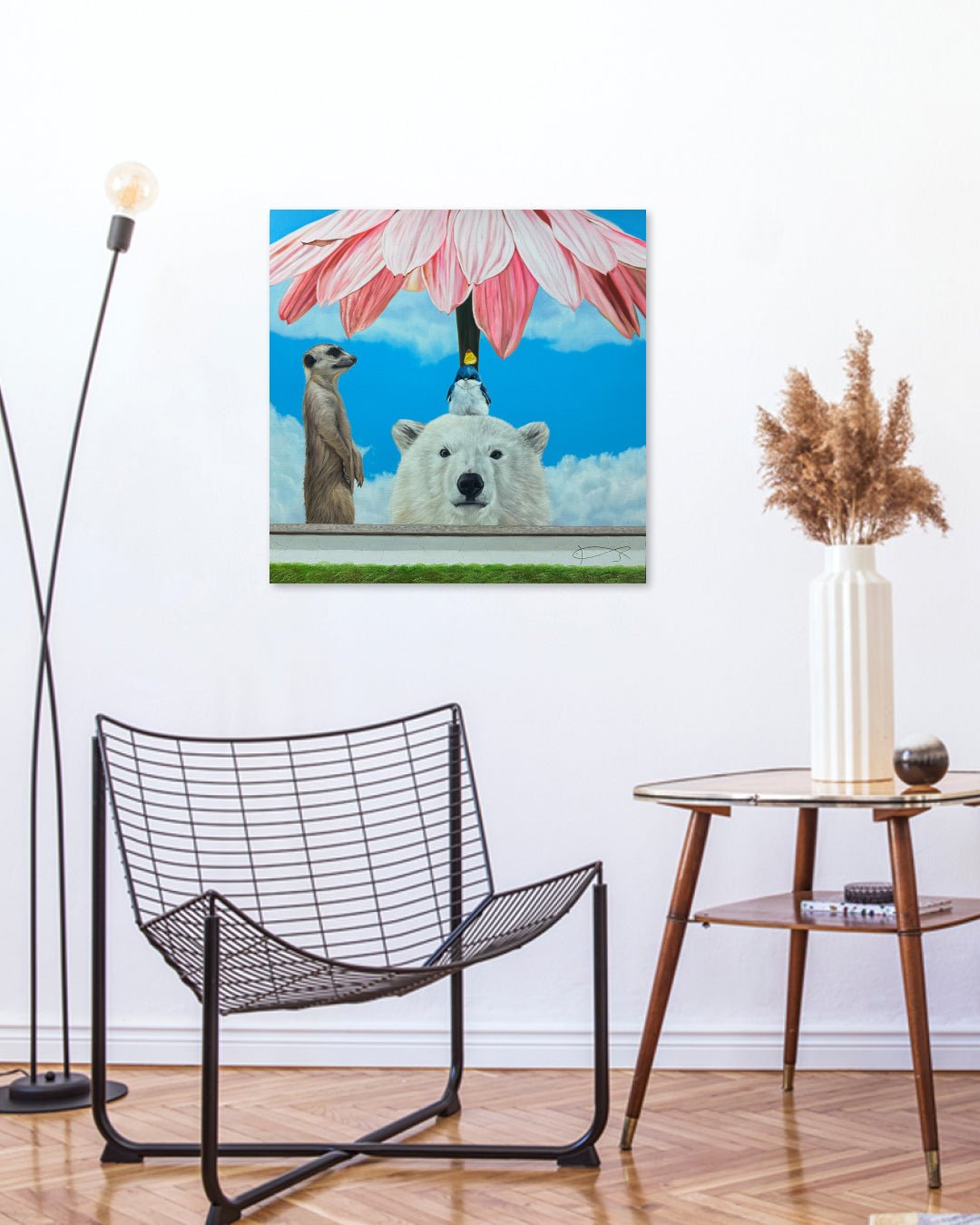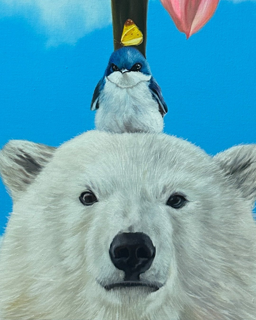 Under the overarching theme of “Symbiosis,” my work imagines a harmonious world where humans, animals, and nature transcend boundaries and coexist as one interconnected family. The animals that appear in these paintings—tigers, polar bears, rabbits, penguins, and many others—are not simply characters within a scene. They represent another face of ourselves, reflecting human emotion, vulnerability, and warmth.