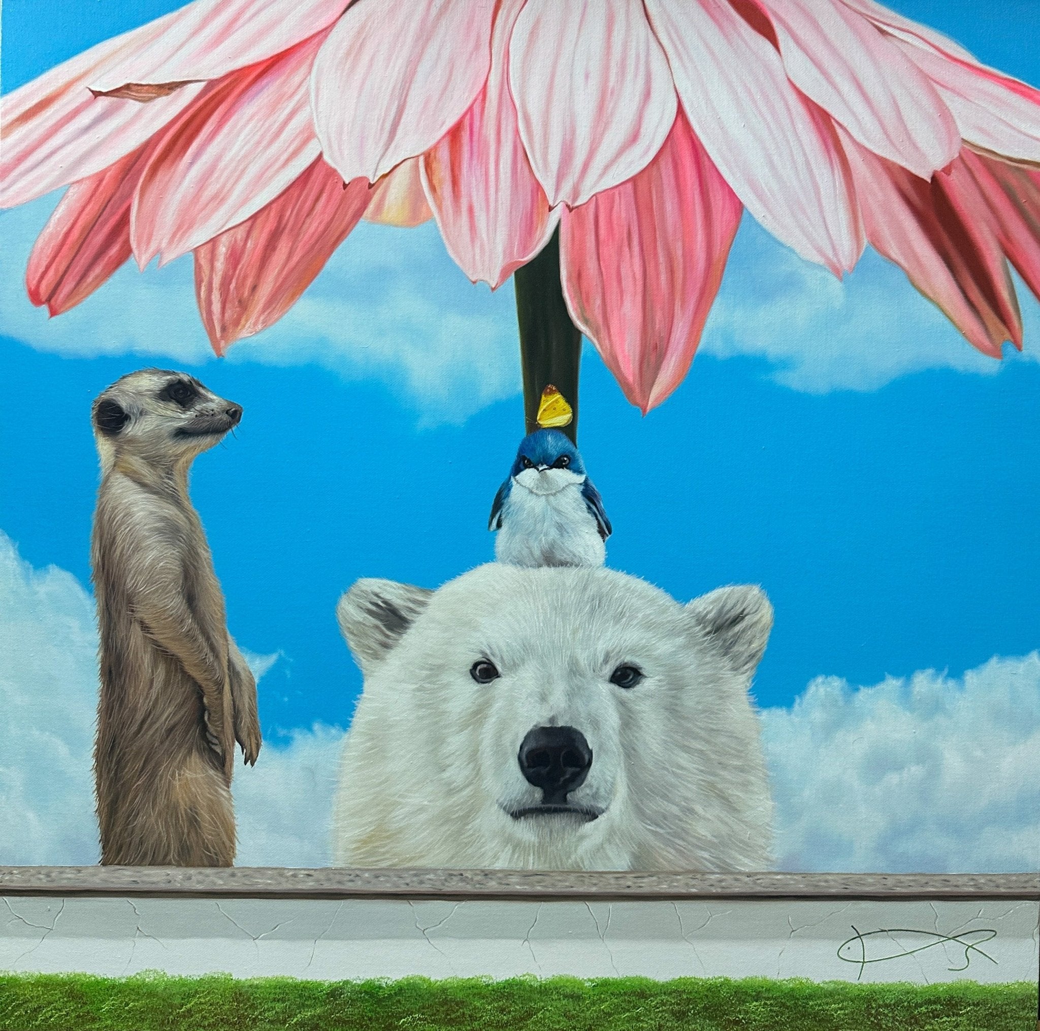 Through vivid, hyperrealistic detail combined with whimsical, fairy-tale-like moments, the work encourages viewers to imagine a joyful world where “you and I are not divided.” At times surreal and at other times tenderly humorous, the scenes highlight the possibility of coexistence rooted in empathy. Ultimately, the paintings invite contemplation on how deeply connected we are—to each other, to other species, and to the natural world itself.