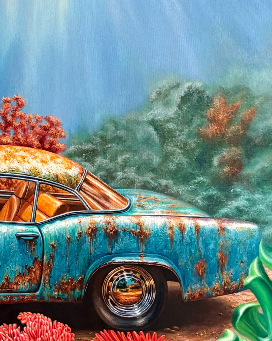 In her recent paintings, still and beautifully timeworn cars—objects that contain memory, weight, and mechanical precision—are placed alongside the flowing, organic movements of flowers and fish. This meeting of the engineered and the natural, the inanimate and the living, creates a visual conversation that expands the viewer’s imagination. The interplay blurs the boundaries between technology and nature, reality and fantasy, suggesting new possibilities for coexistence.